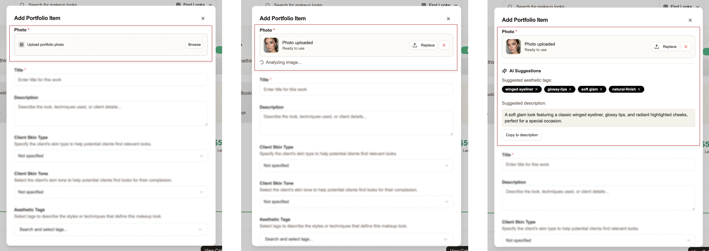 We needed a way for makeup artists to tag and organize their uploaded images without adding friction to the upload process. Manual tagging would have been time-consuming and inconsistent, limiting the accuracy of search results for users.